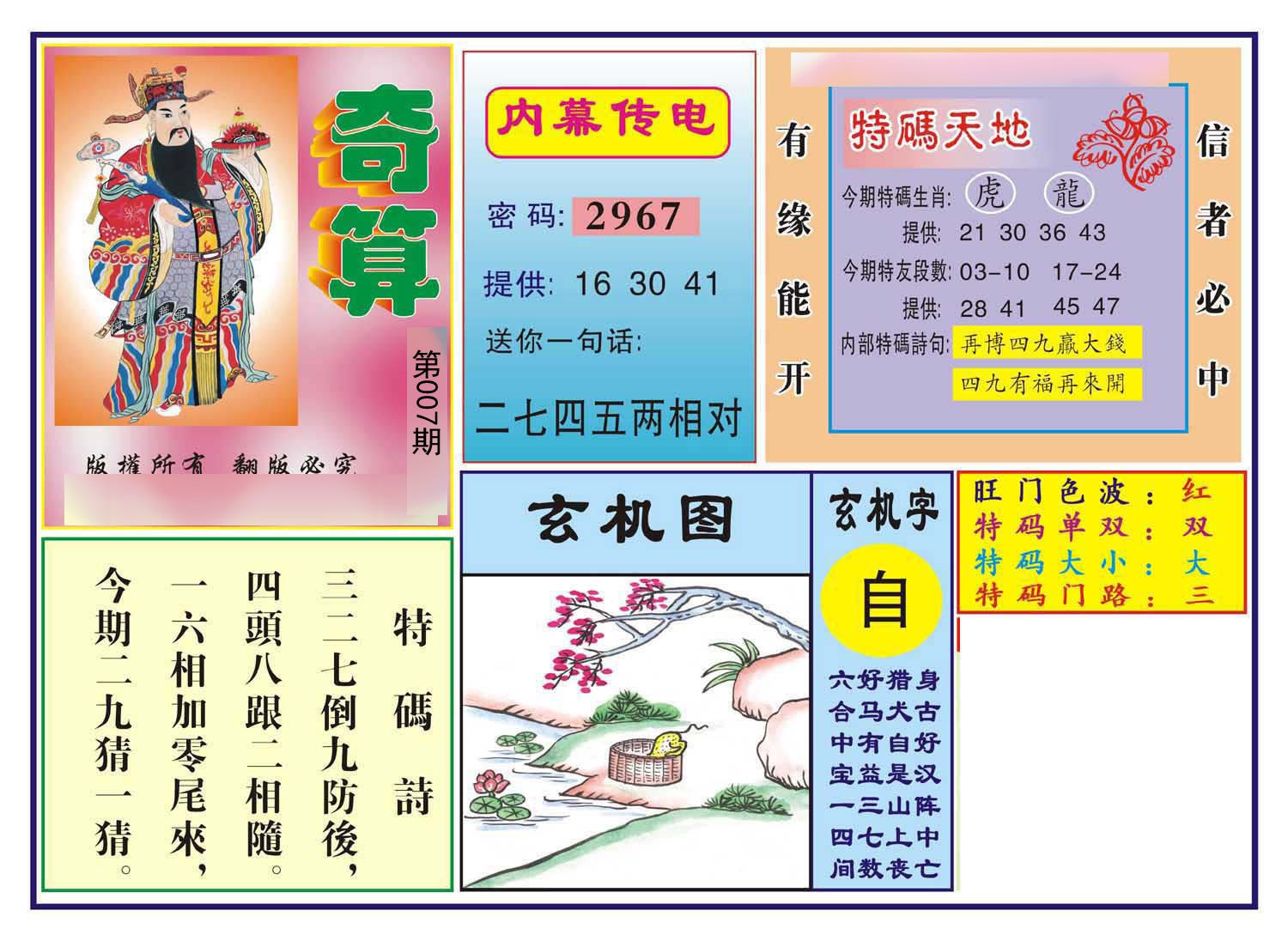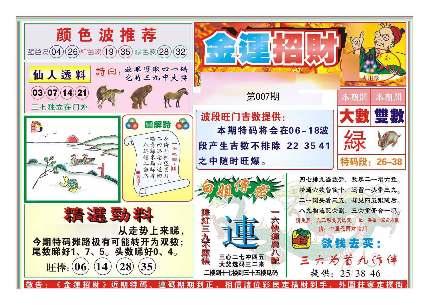 第007期绝杀半波【绿双】开?00准 |