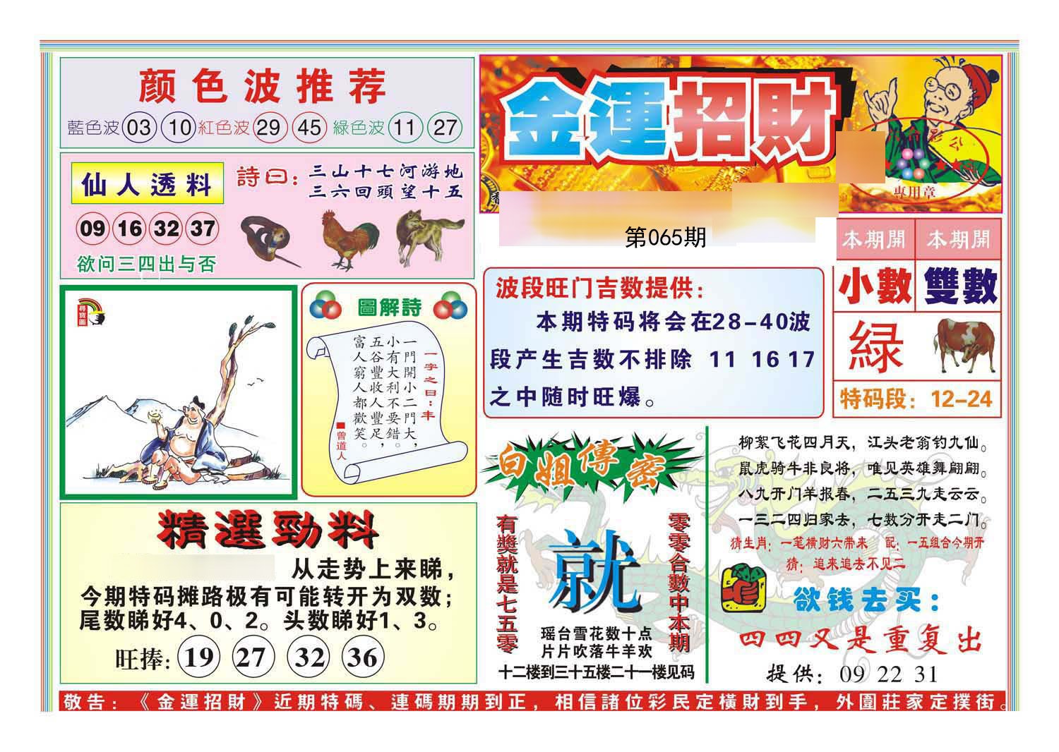第065期绝杀半波【蓝双】开?00准 |